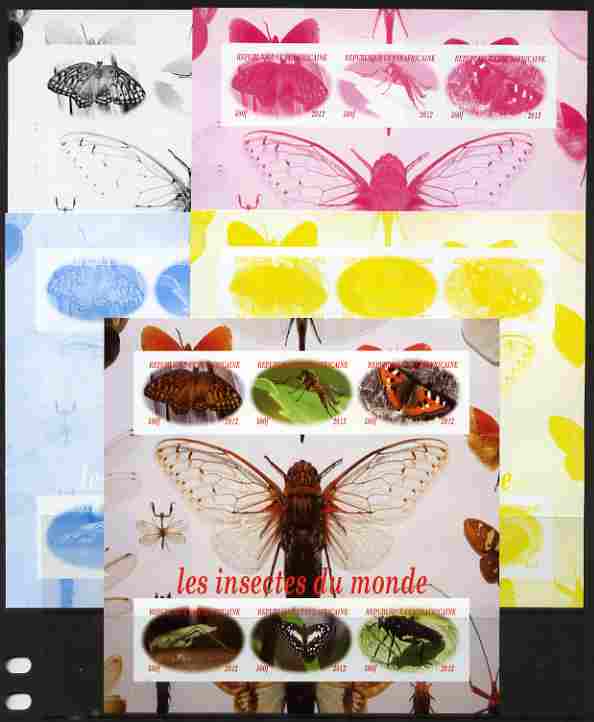 Central African Republic 2012 Insects of the World sheetlet containing 6 values - the set of 5 imperf progressive proofs comprising the 4 individual colours plus all 4-colour composite, unmounted mint