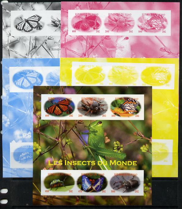 Chad 2012 Insects of the World sheetlet containing 6 values - the set of 5 imperf progressive proofs comprising the 4 individual colours plus all 4-colour composite, unmounted mint.