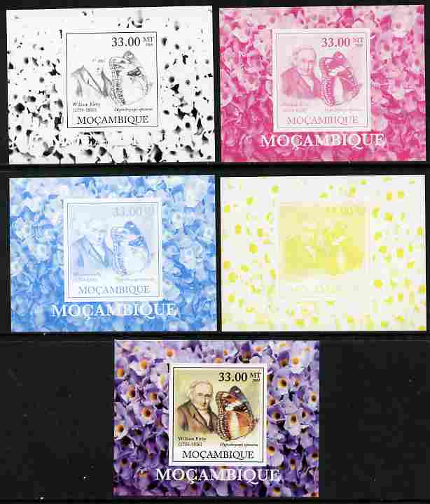 Mozambique 2009 William Kirby Butterflies & Insects #1 individual deluxe sheetlet - the set of 5 imperf progressive proofs comprising the 4 individual colours plus all 4-colour composite, unmounted mint