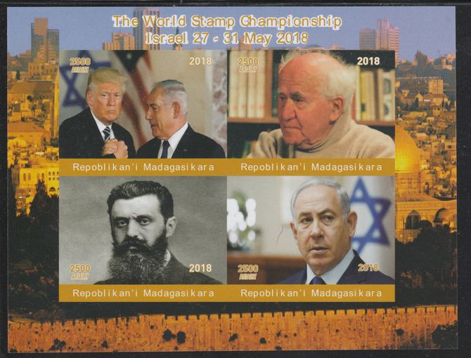 Madagascar 2018 World Stamp Championship (Trump & Ben Guirion) imperf sheetlet containing 4 values unmounted mint. Note this item is privately produced and is offered purely on its thematic appeal.
