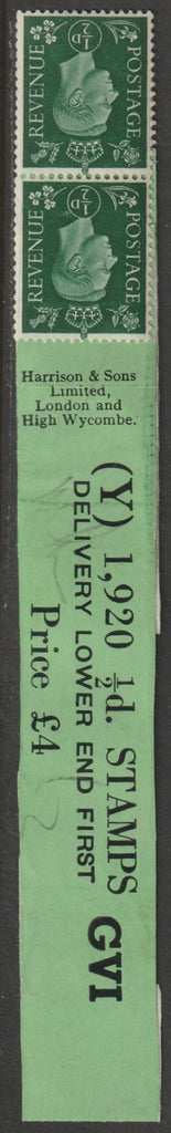 Great Britain 1937 KG6 Dark Colours 1/2d green a fine unmounted mint coil (Y) leader,(1) with 3 stamps attached