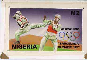 Nigeria 1992 Barcelona Olympic Games (1st issue) - original hand-painted artwork for N2 value (Taekwondo) as issued stamp by G O Akinola, on board 8.5"x5" endorsed A4