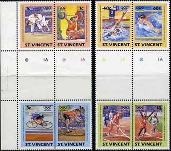 St Vincent 1984 Olympics (Leaders of the World) set of 8 in se-tenant gutter pairs (folded through gutters & 2 stamps creased) from uncut archive proof sheet unmounted mint (SG 812-19)