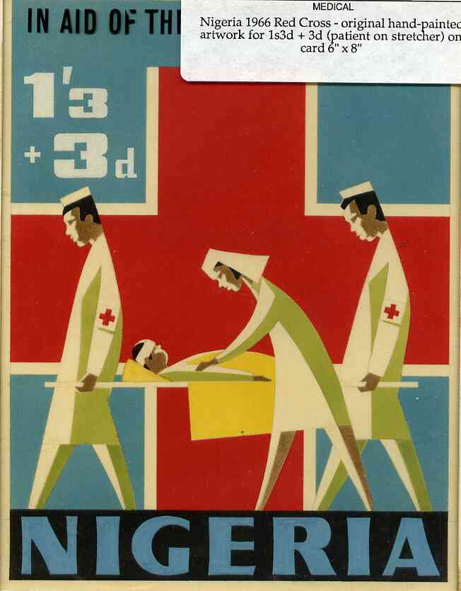Nigeria 1966 Red Cross - original hand-painted artwork for 1s3d + 3d (patient on stretcher) by unknown artist on card 6" x 8"