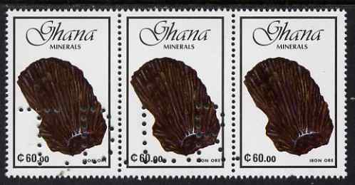 Ghana 1991 minerals 60c Iron Ore strip of 3 with part perfin 'T.D.L.R. SPECIMEN' (Note: blocks of 6 would be required to show the full perfin legend) unmounted mint ex De La Rue archive sheet