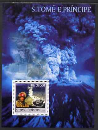 St Thomas & Prince Islands 2003 Volcanoes (with Ash Clouds Fire-fighter & minerals) perf souvenir sheet unmounted mint Mi Bl 1425