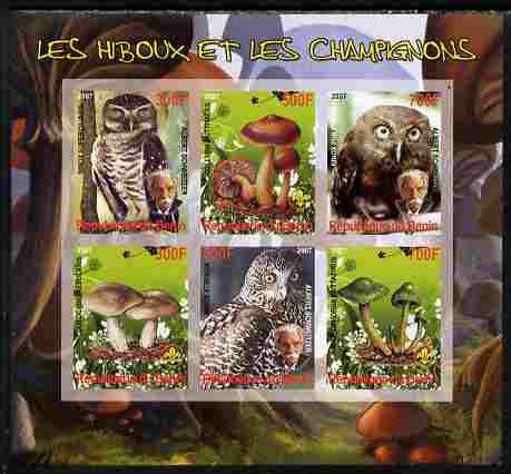 Benin 2007 Owls & Fungi (with Albert Schweitzer) imperf sheetlet containing 6 values unmounted mint. Note this item is privately produced and is offered purely on its thematic appeal