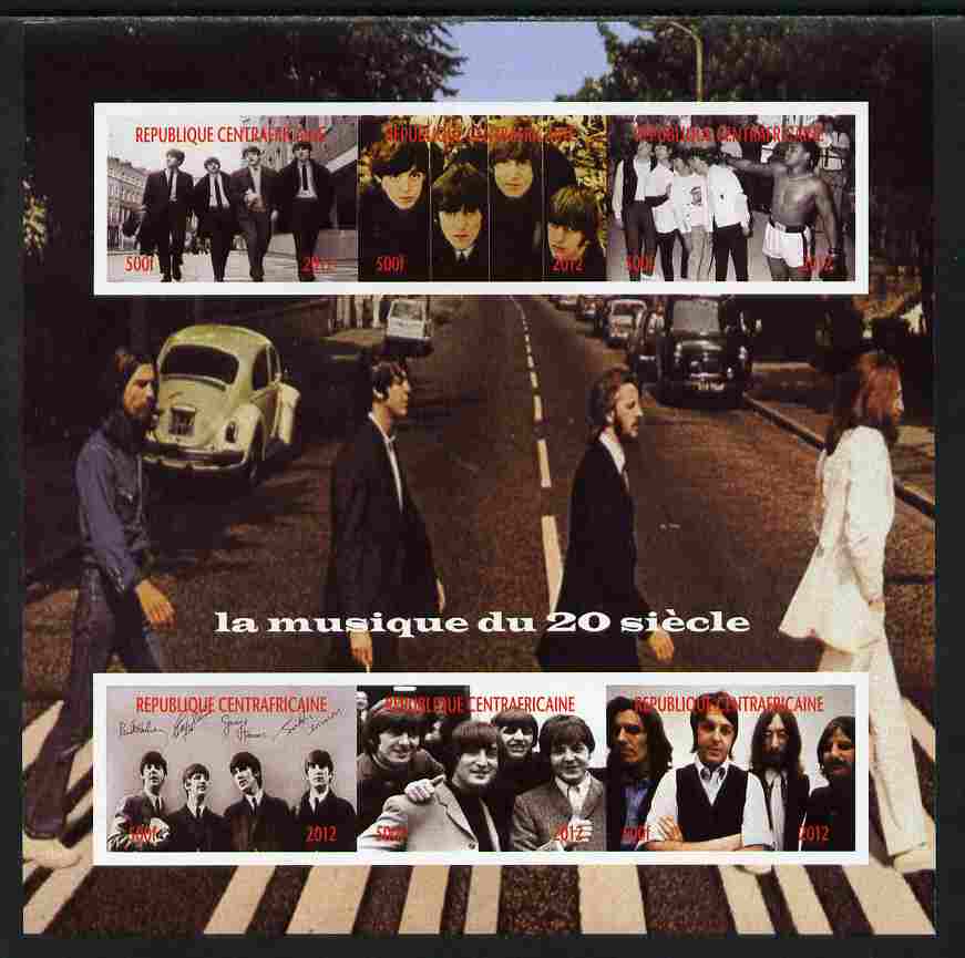 Central African Republic 2012 Music of the 20th Century - The Beatles imperf sheetlet containing 6 values unmounted mint. Note this item is privately produced and is offered purely on its thematic appeal, it has no postal validity
