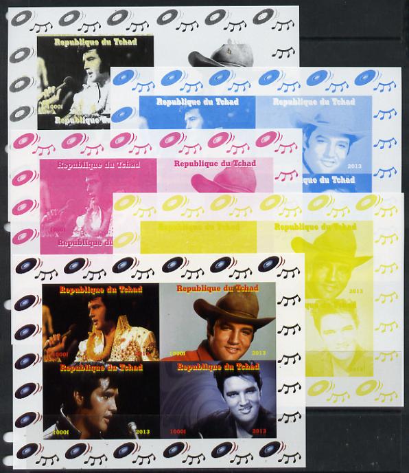 Chad 2013 Elvis Presley #1 sheetlet containing 4 vals - the set of 5 imperf progressive colour proofs comprising the 4 basic colours plus all 4-colour composite unmounted mint.