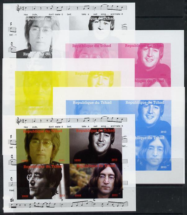 Chad 2013 The Beatles - John Lennon sheetlet containing 4 vals - the set of 5 imperf progressive colour proofs comprising the 4 basic colours plus all 4-colour composite unmounted mint.
