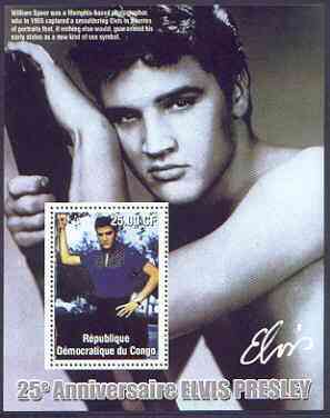Congo 2002 25th Death Anniversary of Elvis Presley perf souvenir sheet #4 (1955 colour pic of Elvis in blue shirt) unmounted mint