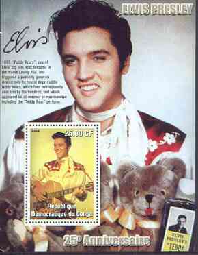 Congo 2002 25th Death Anniversary of Elvis Presley perf souvenir sheet #5 (1957 colour pic of Elvis with Teddy Bears) unmounted mint