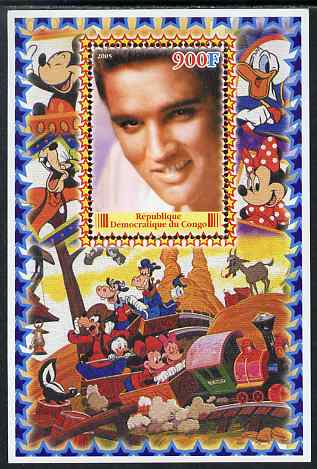 Congo 2005 Elvis Presley #03 perf s/sheet with Disney characters in background unmounted mint. Note this item is privately produced and is offered purely on its thematic appeal