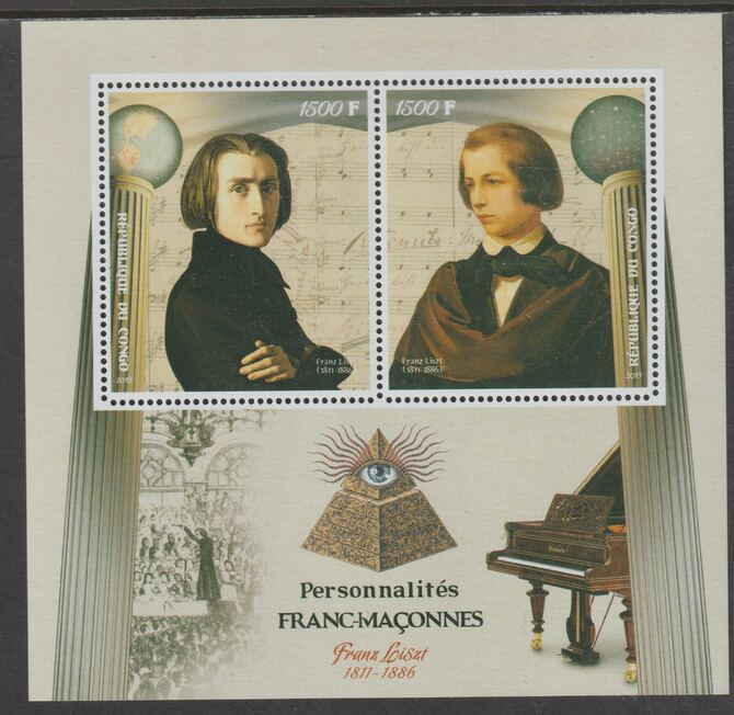Congo 2019 Freemasons - Franz Liszt perf sheet containing two values unmounted mint