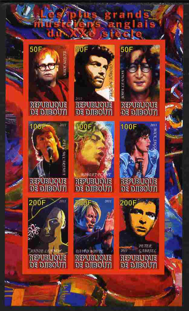 Djibouti 2011 UK Music Stars imperf sheetlet containing 9 values unmounted mint