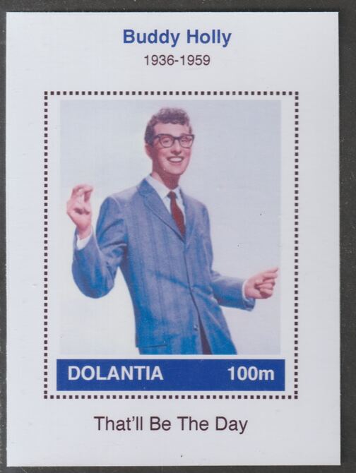 Dolantia (Fantasy) Buddy Holly imperf deluxe sheetlet on glossy card (75 x 103 mm) unmounted mint