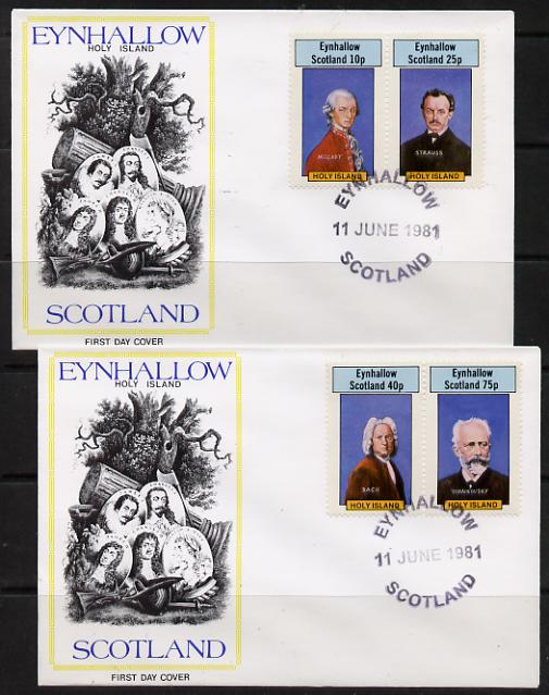 Eynhallow 1981 Composers (Mozart, Strauss, Bach & Tchaikovski) perf set of 4 on two illustrated covers with first day cancels