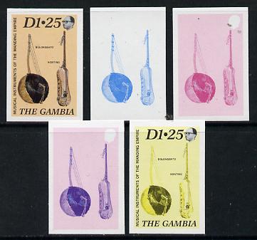 Gambia 1987 Musical Instruments 1d25 (Bolongbato & Konting) set of 5 imperf progressive colour proofs comprising blue & magenta individual colours, two 2-colour composites (blue & magenta and black & yellow) plus all 4 colours (ex……Details Below