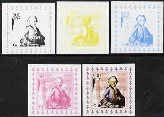 Guinea - Bissau 2006 Mozart #1 individual deluxe sheet - the set of 5 imperf progressive proofs comprising the 4 individual colours plus all 4-colour composite, unmounted mint