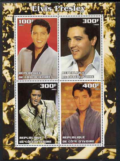 Ivory Coast 2003 Elvis Presley #1 perf sheetlet containing 4 values, unmounted mint. Note this item is privately produced and is offered purely on its thematic appeal