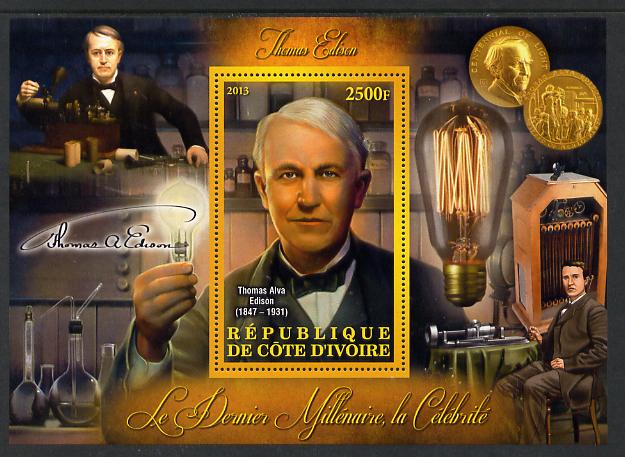 Ivory Coast 2013 Celebrities of the last Millennium - Thomas Edison perf deluxe sheet containing one rectangular value unmounted mint