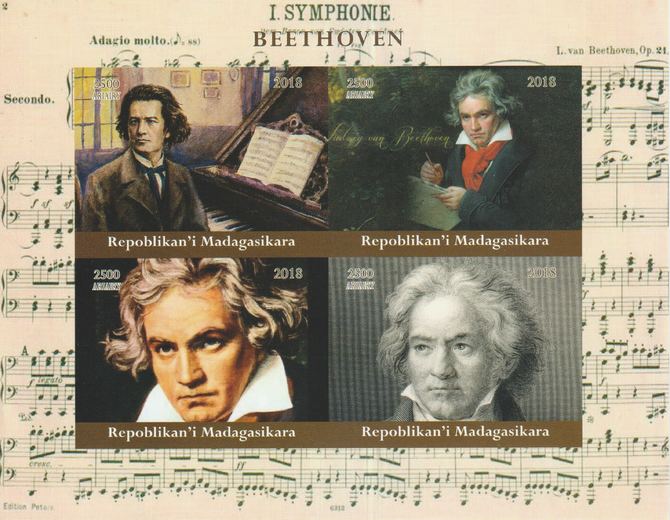 Madagascar 2018 Beethoven imperf sheetlet containing 4 values unmounted mint. Note this item is privately produced and is offered purely on its thematic appeal.