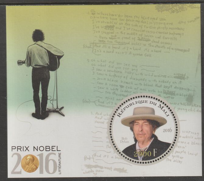 Mali 2016 Nobel Prize for Literature - Bob Dylan perf sheet containing one circular value unmounted mint