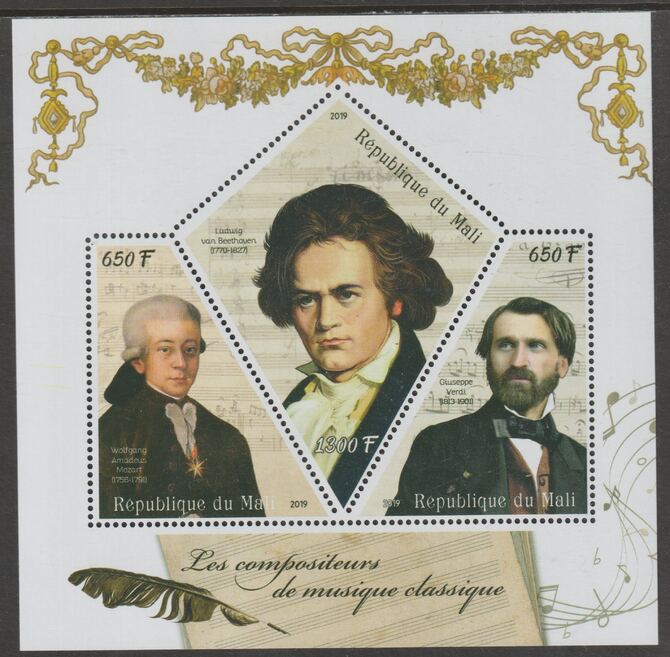 Mali 2019 Classical Composers perf sheet containing three shaped values unmounted mint
