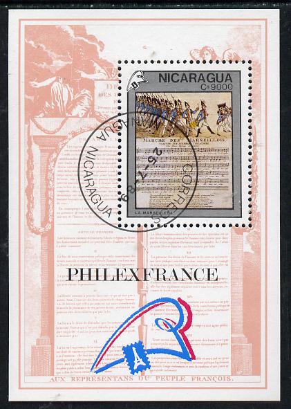 Nicaragua 1989 'Philexfrance 89' Stamp Exhibition (French Revolution & Music score) m/sheet cto used, SG MS 3053