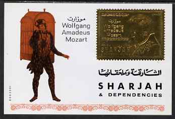 Sharjah 1970 Mozart Commemoration Airmail 4r m/sheet in gold foil unmounted mint, Mi 735B