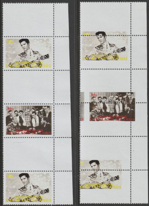 Westpoint Island (Falkland Islands) 1999 Elvis Presley & Scene from Film strip of 3 with perforations and centre stamp misplaced complete with normal, both unmounted mint