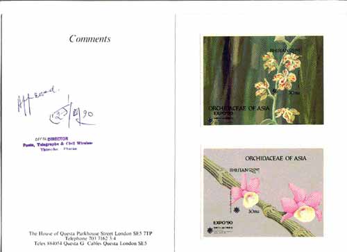 Bhutan 1990 Orchids - Vandopsis parishi & Dendrobium aphyllum imperf m/sheets mounted in Folder entitled 'Your Proofs from the House of Questa', signed and approved by Director PTT, exceptionally rare ex Government archives (Sc 883 & 884)