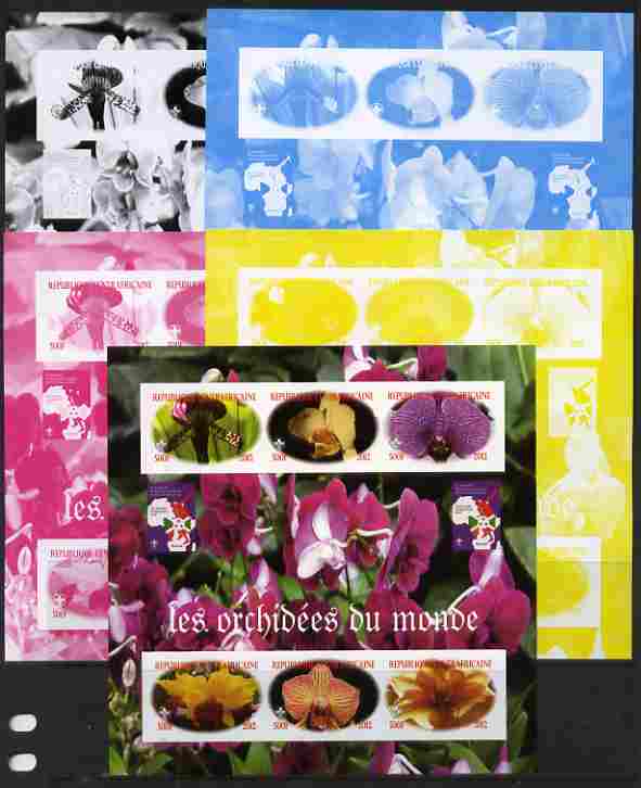 Central African Republic 2012 Orchids of the World sheetlet containing 6 values - the set of 5 imperf progressive proofs comprising the 4 individual colours plus all 4-colour composite, unmounted mint