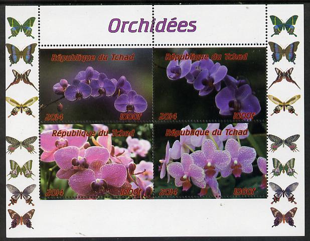 Chad 2014 Orchids #1 (with Butterflies in side margins) perf sheetlet containing 4 values unmounted mint. Note this item is privately produced and is offered purely on its thematic appeal.