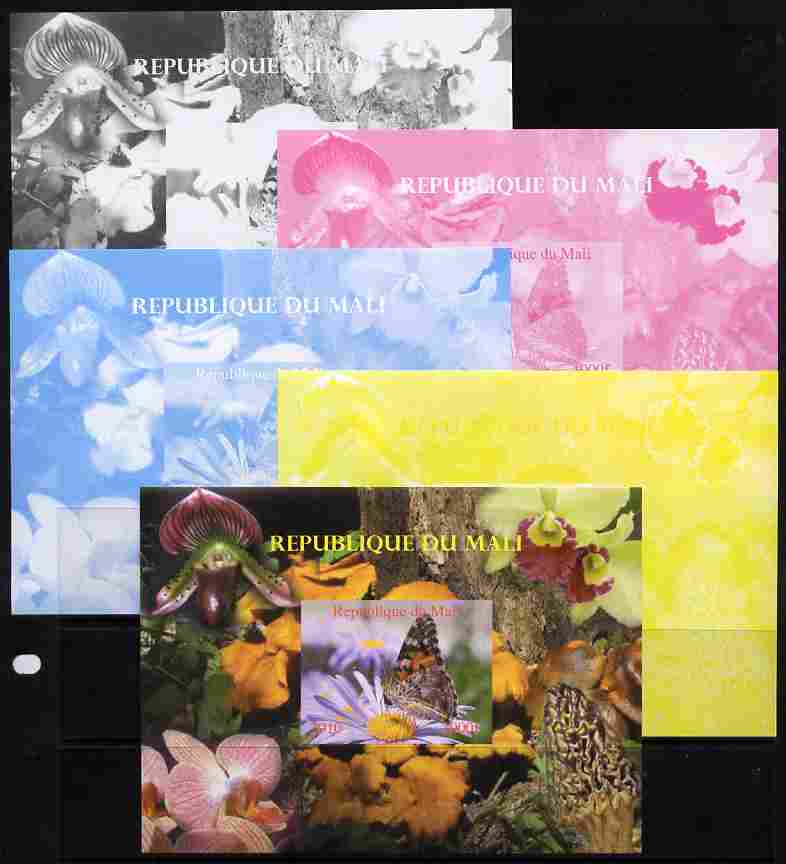 Mali 2010 Butterflies #03 with Orchids & Fungi in background s/sheet - the set of 5 imperf progressive proofs comprising the 4 individual colours plus all 4-colour composite, unmounted mint