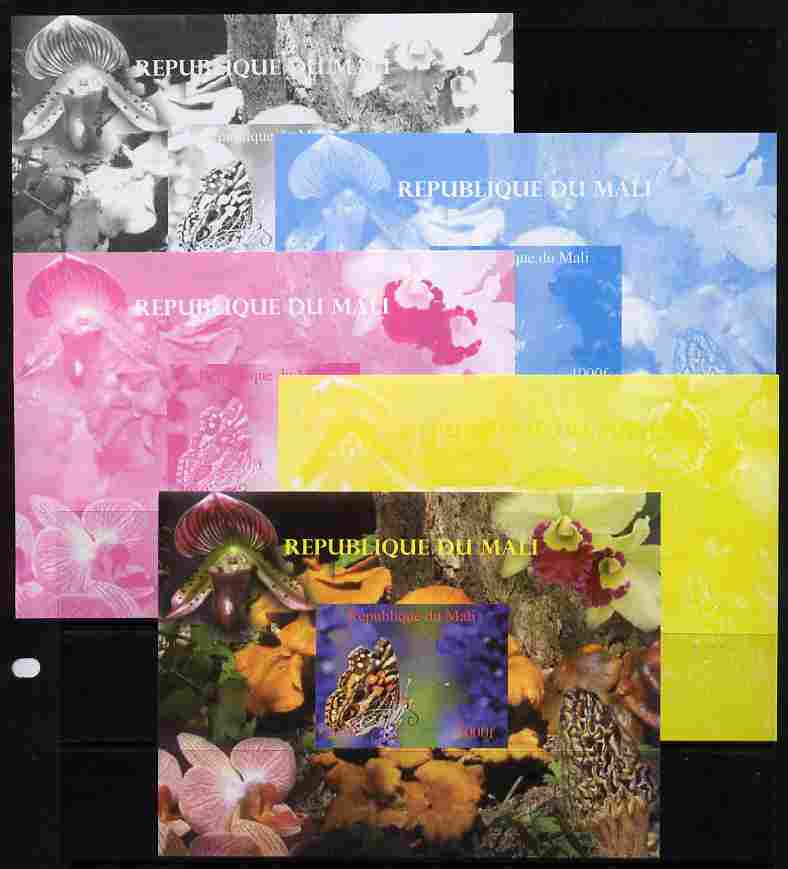 Mali 2010 Butterflies #05 with Orchids & Fungi in background s/sheet - the set of 5 imperf progressive proofs comprising the 4 individual colours plus all 4-colour composite, unmounted mint