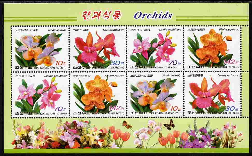 North Korea 2011 Orchids perf sheetlet containing 8 values ( 2 sets of 4) unmounted mint
