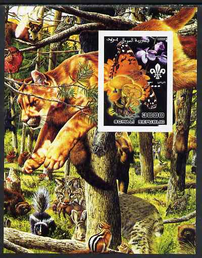 Somalia 2002 Butterflies, Orchids & Fungi #3 imperf m/sheet with Scout Logo & various animals in background, unmounted mint