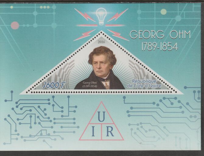 Ivory Coast 2016,Georg Ohm Commemoration perf deluxe sheet containing one triangular value unmounted mint