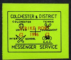 Cinderella - Great Britain 1996 Colchester & District Messenger Service imperf label (black on green) showing Football, Tennis, Cricket & Bicycle opt'd Strike Post £2 1996 unmounted mint
