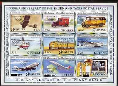 Guyana 1992 Anniversaries opt in black (Albertville Olympics) on sheetlet of 9 (150th Anniversary of Penny Black and Thurn & Taxis Postal Anniversary - Mail Transport) unmounted mint