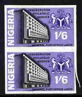 Nigeria 1969 Inauguration of Philatelic Service 1s6d imperf colour trial proof pair in black & violet each with scissor cut and other faults as SG 216