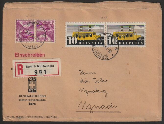 Switzerland 1941 Registeredcover bearing 10c Mobile PO x 2 plus 10c Landscapes tete-beche pair with Bern cancels