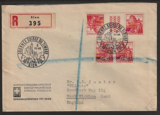 Switzerland 1946 registered cover bearing 2 x 20c Landscapes tete-beche pairs with special Stamp Day cancel