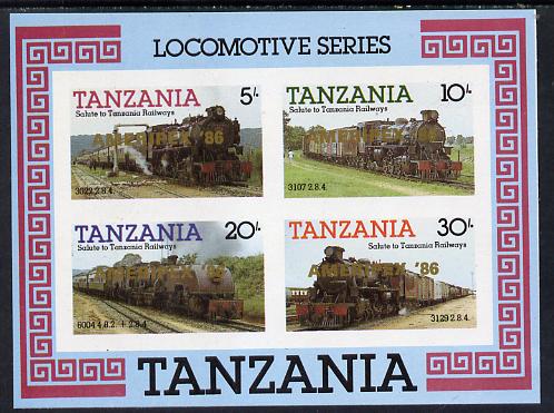 Tanzania 1985 Locomotives imperf proof miniature sheet with 'AMERIPEX 86' opt in gold (unissued) unmounted mint