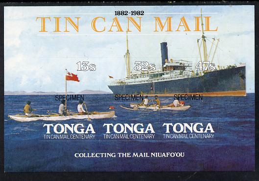 Tonga 1982 Tin Can Mail Centenary self-adhesive m/sheet opt'd SPECIMEN, as SG MS 821 (mail canoe & ship) unmounted mint