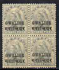 Indian States - Gwalior 1899-1911 QV 3p grey block of 4 overall toning but unmounted mint SG 39