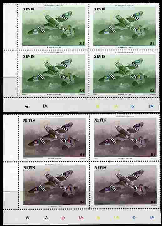 Nevis 1986 Spitfire $4 (Mark XXIV) with red omitted plus normal each in unmounted mint matched corner blocks from the lower left corner with plate numbers & colour checks as SG 375.,