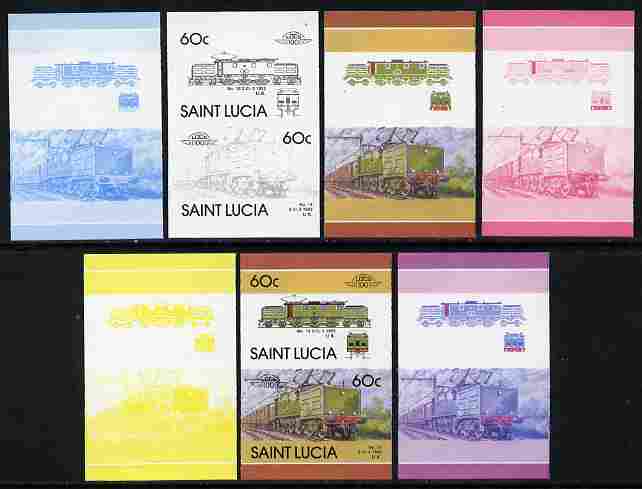 St Lucia 1986 Locomotives #5 (Leaders of the World) 60c No.13 Electric Loco se-tenant pair - the set of 7 imperf progressive proofs comprising the 4 individual colours plus 2, 3 and all 4-colour composite, unmounted mint as SG 864a