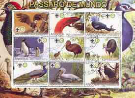 Angola 2000 Exotic Birds perf sheetlet containing set of 9 values each with Rotary & Scouts Logos, fine cto used